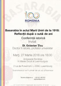 Marti, 28 martie, incepand cu ora 18.00, va avea loc in incinta Ambasadei Romaniei din Marele Ducat al Luxemburgului o conferinta istorica al carei invitat este Dl. Octavian Ticu, doctor in istorie si profesor universitar.